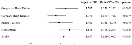 At the same time, in Figure 3, the odds ratio normalized by age and sex shows that participants with a family income under the poverty threshold have increased odds of suffering from congestive heart failure (OR = 1.702; CI95% = 1.358–2.132; p < 0.001), coronary heart disease (OR = 1.371; CI95% = 1.089–1.726, p = 0.007), angina pectoris (OR = 1.481; CI95% = 1.128–1.945; p = 0.005), heart attack (OR = 1.838; CI95% = 1.485–2.275; p < 0.001), and stroke (OR = 1.647; CI95% = 1.329–2.042; p < 0.001).