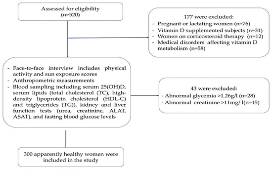 Exclusion criteria included women suffering from malabsorption diseases, cancer, liver and kidney disorders, pregnant or lactating women, women who had taken vitamin D supplements in the last six months, and women on drugs known to alter vitamin D metabolism. Women with cardiovascular diseases (e.g., myocardial infarction, stroke…) and diabetes mellitus were also excluded (Figure 1).