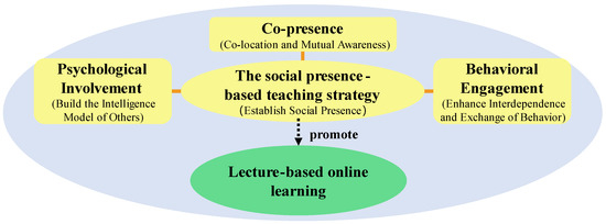 The present study aimed to explore whether a social presence (SP)-based teaching strategy can provide students with important social cues about the presence of peers in a lecture-based online learning community, thereby enhancing students’ social presence and resulting in meaningful learning. Previous research has not directly designed instructional strategies that address the presence of peers based on theoretical frameworks in the field of social presence. The theoretical framework of social presence describes the dimensions of social presence, and an in-depth understanding of social presence helps to scientifically design teaching strategies to enhance the presence of peers, thereby enhancing students’ perceived social presence. Therefore, based on Biocca et al.’s (2003) [29] social presence theory, this study proposed an SP-based teaching strategy to improve lecture-based online instruction by designing online activities that aimed to enhance students’ social presence. Additionally, the researchers implemented six online learning activities under the guidance of this SP-based teaching strategy as an intervention that focused on improving students’ social presence in an online course. To examine the effect of the SP-based teaching strategy, this study compared students’ social presence, social interaction, and academic performance from lecture-based online learning supported by either a conventional teaching strategy or an SP-based teaching strategy. The research questions were as follows: