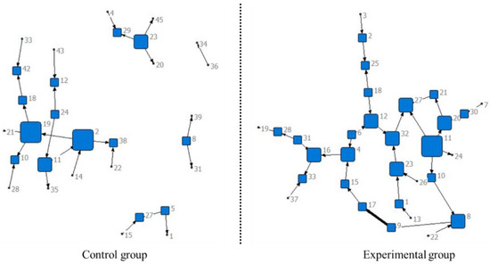 During the treatment phase, the CG formed one subgroup. A total of 9.3% of the CG students appeared in the subgroups (Table 6). The EG members formed 11 subgroups, and 68.4% of all the EG students appeared in the subgroups (Table 6). Moreover, many members of the EG, such as members 9, 17, and 24, appeared in multiple subgroups at the same time, indicating that they actively interacted with others.