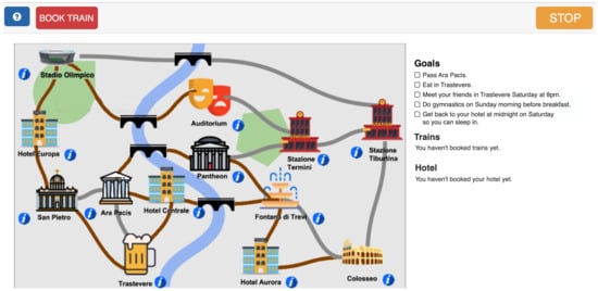 In the Weekend in Rome task, users have to organize virtual train and hotel reservations and complete various activities, such as visiting specific locations and attending particular events. To execute these tasks, users have to navigate a map where the goals are those typically encountered in the real-life planning of trips (e.g., making reservations, checking bus schedules, and noting opening hours of specific locations). This scenario is encoded as a planning problem using PDDL (Planning Domain Definition Language) (). This approach enables the generation of numerous instances of the problem, each with different goals and constraints. This is possible because the planner can be used to assess the feasibility of each instance.