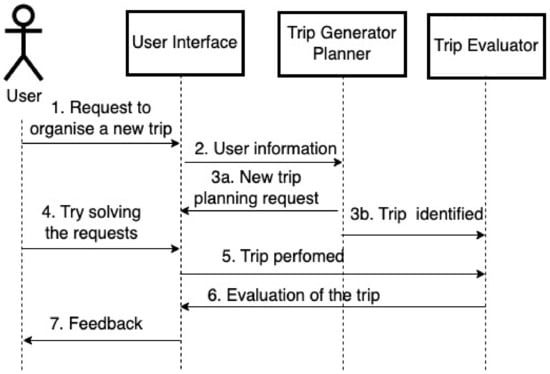 The planner is used in different phases of the training process, namely, for the generation of new solvable exercises and for the evaluation of solutions. The interaction between the user and the planner is depicted in Figure 3. The Trip Generator is activated when the user is required to undertake a new instance of the task (1). It takes as input the user profile and the level of difficulty of the new task (2), and generates a new problem instance by extracting the goals to be achieved by the user from a set of possible goals at random (3a). Successively, the Trip Generator calls the planner to find a plan that solves the new instance of the problem (3b). If the planner fails, steps (3a) and (3b) are repeated, and other goals are selected until a solvable scenario is created (3b). Once a solvable scenario is generated, the user can start to execute the task (4). At the end of the exercise, upon the user’s completion of their visits by taking the return train (5), another component is initiated, the Trip Evaluator (6). The Trip Evaluator quantifies the number of goals achieved, assigning a percentage rating to the user ranging from 0 to 100. A difficulty level is deemed to have been completed successfully when the obtained percentage is at least 80%. Consequently, it is possible to pass the instance of the problem even if the plan has not been fully executed. Additionally, the Trip Evaluator provides feedback to the user on the plan implemented (7). For example, “Congratulations! You completed this exercise without any errors” when a difficult exercise is passed, or “This exercise was much more difficult than the previous one. Try to keep track of bus schedules” in case of failure.