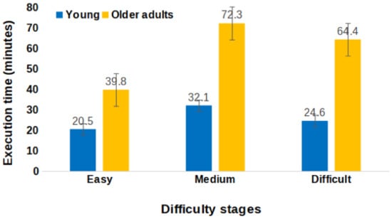 To test the difficulty stage proposed by the Trip Generator, a repeated-measures ANOVA was carried out on execution time. The between-subject factor was group (young and older adults), while the within-subject factor was difficulty stage (easy, medium, and difficult). The simple effects of group (F (1, 20) = 20, p < 0.001) and difficulty stage (F (2, 40) = 17.43, p < 0.001) were significant. It is noteworthy that the interaction between group and difficulty stage was significant (F (2, 40) = 5, p = 0.012) (see Figure 4). To better understand the source of this interaction, planned comparisons were performed. Older adults were slower than younger adults for all difficulty stages. Furthermore, older adults were slower in the medium and difficult stages relative to the easy stage. Interestingly, no significant differences emerged between the medium and difficult stages for both young and older participants.