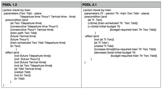 Since these features were not supported by the planner used in versions 0.0 and 0.1 (PDDL4J), which only supports PDDL 1.2, it became necessary to rewrite the domain using PDDL 2.1, introducing functions for the representation of time and budget. Consequently, an upgrade was implemented with the Expressive Numeric Heuristic Search Planner (ENHSP) (), which supports fluents and plan metrics as required by PDDL 2.1. Figure 5 provides an illustration of the transition from PDDL 1.2 to 2.1. It presents the encoding of the action “travel-by-train”, which implements the train trip to Rome, utilizing budget and time as fluents. The definition of the planning domain was improved by employing a more expressive language. Indeed, several predicates were required to implement the progression of time in PDDL 1.2. These were used to represent that two time instants are consecutive and to state that they are not in the future anymore when the action is executed. In contrast, in PDDL 2.1, increasing the time variable was sufficient.