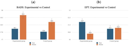 Furthermore, a comparison of the results of the experimental group with those of the control group was carried out (see Figure 6). Separate repeated-measures ANOVAs were conducted on the BADS and EPT scores. The between-subject factor was group (experimental and control group), while the within-subject factor was time (test, retest). No interaction effects reached the significance level. The BADS total score showed a significant simple effect of time (F (1, 20) = 11.28, p = 0.003). Planned comparisons revealed a significant improvement only for the experimental group (p = 0.048). The effectiveness data are inconclusive. To enhance the reliability of the training results, it would be prudent to expand the size of the two groups. Additionally, the T1 data indicate a ceiling effect, which implies that the selected tests may have been too straightforward for the participants to demonstrate a change in performance.