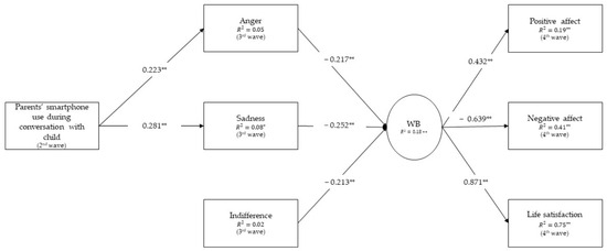 The effects of parents’ smartphone use through children’s emotional reactions in situations of technoference on children’s well-being: the results derived from testing the final model. Note: ** p < 0.01; * p < 0.05.