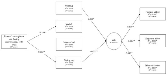 The effects of parents’ smartphone use through children’s behaviors in situations of technoference on children’s well-being: the results derived from testing the final model. Note: ** p < 0.01; * p < 0.05.