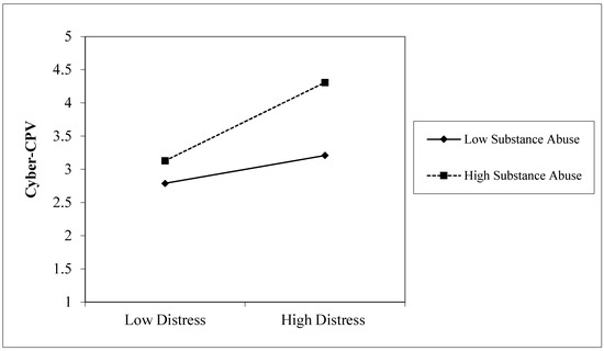 Figure 1 shows the hypothetical model in which bidirectional relationships between Cyber-CPV, CPV, and distress were analyzed. Cross-lagged paths were estimated, including reciprocal effects between the variables assessed at W1 and W2. The model also included autoregressive paths for Cyber-CPV, CPV, and distress, as well as cross-lagged paths for the family-related variables (exposure to family violence, parental ineffectiveness, parental impulsivity, and punitive discipline) and the individual variable substance abuse, all measured at W1, as predictors of Cyber-CPV and CPV at W2. This allowed the identification of the factors associated with changes in Cyber-CPV over time. The hypothesized model yielded the following fit indices: S-B χ2(22, n = 1034) = 24.37, RMSEA = 0.01 (90% CI [0.00, 18.67]), NNFI = 1.00, CFI = 1.00, and SRMR = 0.03. Then, the nonsignificant paths were eliminated to create a more parsimonious model. The final model (see Figure 2) showed excellent fit indices: S-B χ2(16, n = 1034) = 14.78, RMSEA = 0.0 (90% CI [0.00, 11.80]), NNFI = 1.00, CFI = 1.00, and SRMR = 0.03. The model explained 37.00% of the variance in Cyber-CPV, 36.00% in CPV, and 49.00% in distress. All the autoregressive paths were statistically significant, indicating the stability of the variables over the six-month interval. Figure 2 illustrates two bidirectional relationships: (1) Cyber-CPV at W1 did not predict CPV at W2, whereas CPV at W1 did predict Cyber-CPV at W2. (2) Cyber-CPV at W1 predicted distress at W2, while distress at W1 predicted Cyber-CPV at W2. Substance abuse at W1 significantly predicted both Cyber-CPV and CPV at W2, whereas punitive discipline at W1 predicted only CPV at W2. Additionally, the interaction term (distress × substance abuse) at W1 predicted Cyber-CPV at W2. As shown in Figure 3, when both distress and substance abuse were high, levels of Cyber-CPV increased significantly (Slope 1 [high substance abuse]: β = 0.59, t = 3.11, p < 0.01). In contrast, when substance abuse was low, distress did not significantly predict Cyber-CPV (Slope 2 [low substance abuse]: β = 0.21, t = 1.57, p = 0.12). Exposure to family violence, parental impulsivity, and punitive discipline at W1 were not significantly associated with Cyber-CPV at W2.