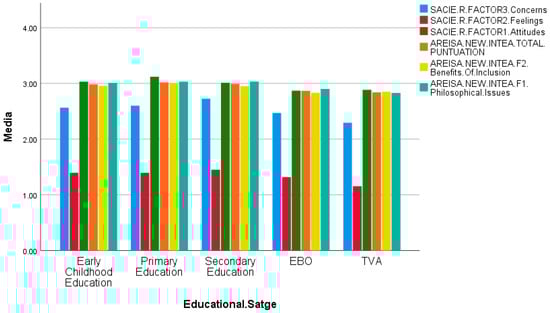 In Table 3, the ANOVA analysis for different educational stages using the SACIE-R instrument reveals significant differences in all three factors (p < 0.001). In the post hoc analyses for the “Attitudes” dimension, Primary Education shows significant differences compared to Early Childhood Education and Basic Obligatory Education (E.B.O) (p = 0.005), Secondary Education (p < 0.001), and Transition to Adulthood (T.V.A) (p = 0.031). With a higher mean score in this dimension, it indicates more positive attitudes toward inclusion. In the post hoc analyses for “Feelings,” Secondary Education shows significant differences compared to Early Childhood Education (p = 0.021), Primary Education (p = 0.014), and T.V.A (p < 0.001), as well as a trend towards significance compared to E.B.O (p = 0.055). With a higher mean score than the other groups, Secondary Education presents the worst feelings towards inclusion. Additionally, T.V.A shows significant differences compared to Early Childhood Education and Primary Education (p = 0.005), and Secondary Education (p < 0.001). T.V.A has better feelings toward inclusion as it has a lower mean score. Regarding the post hoc analyses for “Concerns,” Secondary Education shows significant differences compared to Early Childhood Education, Primary Education, and T.V.A (p < 0.001), and E.B.O (p = 0.009). Secondary Education has a higher mean score, indicating more concerns regarding inclusion. Furthermore, T.V.A shows significant differences compared to Early Childhood Education (p = 0.027), Primary Education (p = 0.012), and Secondary Education (p < 0.001), having better concerns towards inclusion as it has a lower mean score.