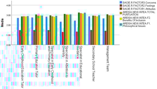 Conversely, the variables “Feelings” and “Concerns” show an inverse relationship, meaning that as one increases, the other decreases, and vice versa. Consequently, higher scores in these dimensions indicate less favorable perceptions of inclusive education.