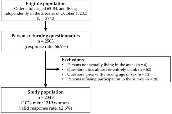Of the 3742 individuals invited to participate, 2503 returned the questionnaires (response rate: 66.9%). After excluding participants who did not live in the target area (n = 6), returned either almost or entirely blank questionnaires (n = 62), had missing identification labels (n = 72), or refused to participate (n = 20), a final sample of 2343 older adults was included in the analysis (valid response rate: 62.6%; Figure 1).