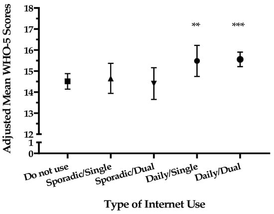 Adjusted mean WHO-5 scores by internet use frequency and purpose. Error bars represent 95% confidence intervals. Means are adjusted for covariates. ** p < 0.01, *** p < 0.001 compared to the “Do not use” group.