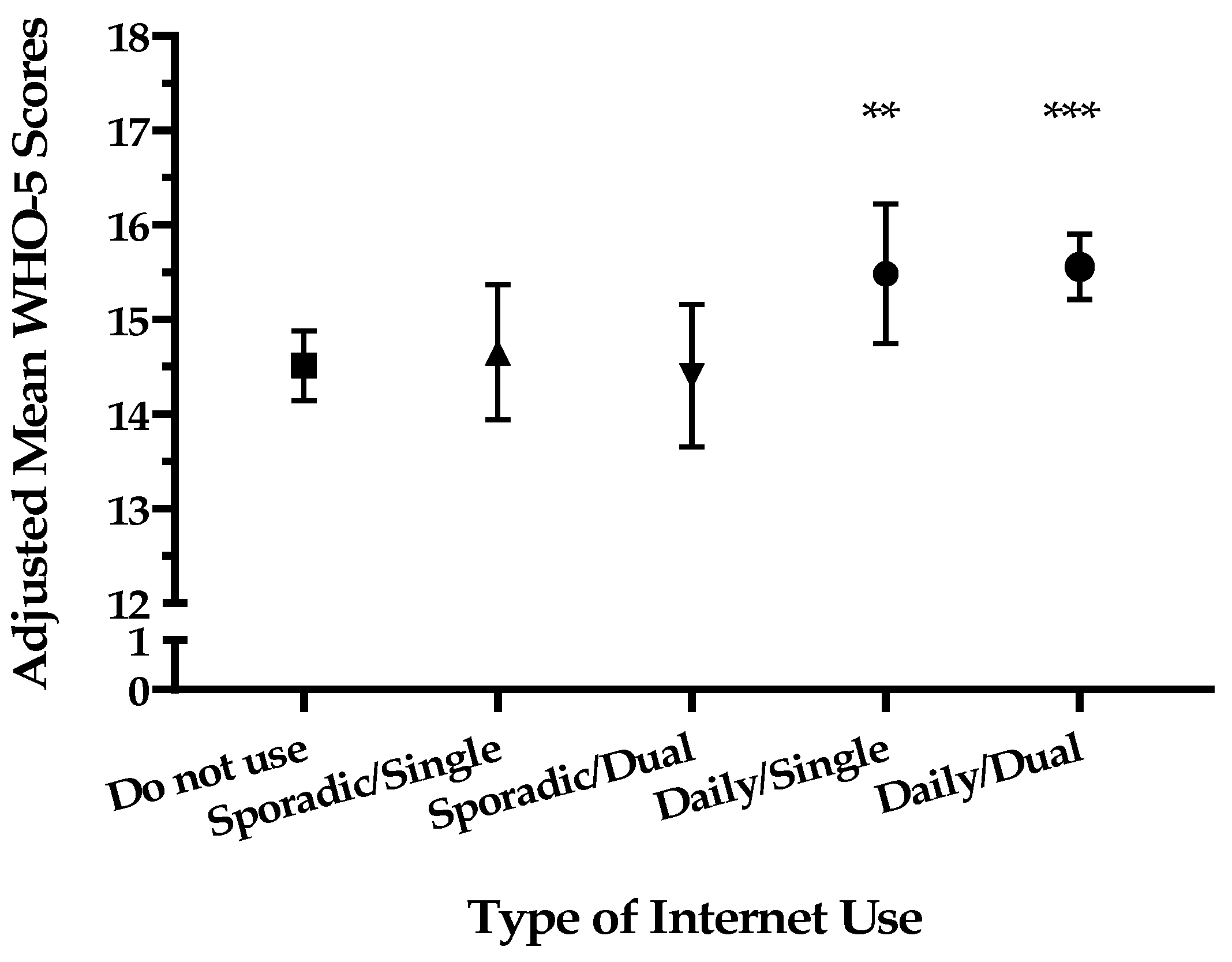 - Vidiasratri, A. R., & Bath, P. A. (2022). Association between internet usage and quality of life of elderly people in England: Evidence from the English Longitudinal Study of Ageing (ELSA). International Journal of Environmental Research and Public Health, 19(23), 15544. [Google Scholar] [CrossRef] [PubMed]