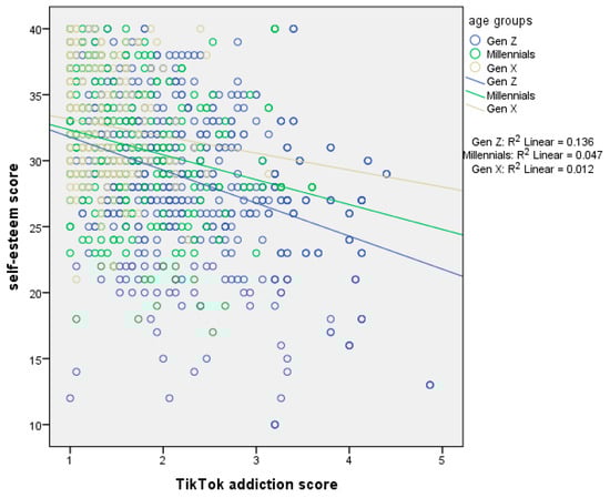 Moreover, our results indicated a negative association between TikTok addiction and self-esteem. This association was more prominent among males and Generation Z. This finding comes to be added to in the general context that TikTok affects mental health negatively, including self-esteem. More specifically, it is supported that prolonged TikTok use leads users to immerse themselves in a digital world where unrealistic body and lifestyle standards dominate. This daily interaction with non-achievable standards and stereotypes drives them to self-esteem issues, body dissatisfaction, and damaged self-perception (