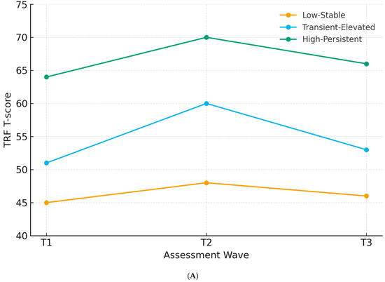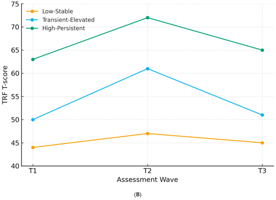 Figure 1A,B displays class-specific trajectories with 95% confidence intervals, illustrating the stability of the low-stable groups, the temporary spike in the transient-elevated groups, and the persistently high scores in the high-persistent groups (see Table 2A,B for the means).