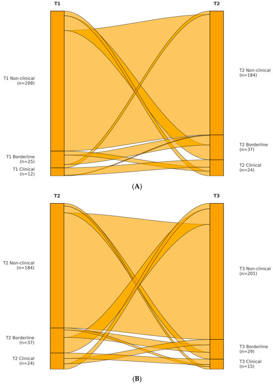 To complement the statistical trajectory analysis, we examined the clinical significance of symptom changes by classifying students into non-clinical, borderline, or clinical ranges according to TRF cutoffs. Figure 2A,B (alluvial diagram) illustrates movement across these categories from T1 to T2 to T3.