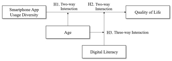 Understanding the relationship between SAUD and quality of life requires considering not only individual differences in digital literacy but also age-related factors. We suggest that the impact of SAUD is unlikely to be uniform across the population: individuals with higher digital literacy can leverage multiple applications effectively, whereas those with lower digital skills may experience stress or inefficiency. At the same time, age shapes cognitive resources, motivational priorities, and adaptability to technology, which can further modulate the consequences of diverse app use. By examining a three-way interaction among SAUD, digital literacy, and age, we can capture these sophisticated dynamics, identifying conditions under which app diversity acts as a resource versus a burden. This approach allows for a more precise understanding of how technological engagement translates into well-being across different age groups and skill levels.