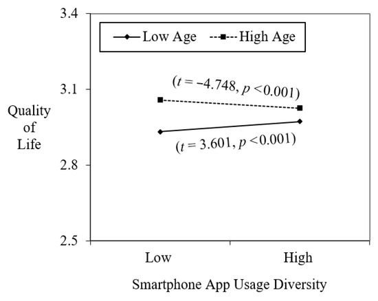 When digital literacy is low, smartphone app usage diversity is negatively associated with quality of life for both age groups, and this negative association is stronger among older than younger individuals.