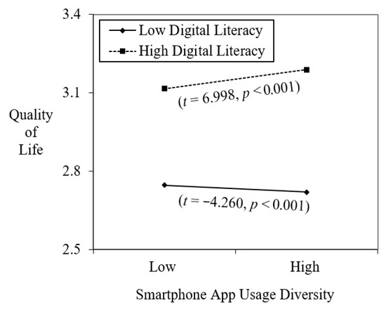 Digital literacy moderates the relationship between smartphone app usage diversity and quality of life, such that the relationship is positive when digital literacy is high, but negative when digital literacy is low.