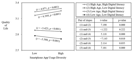 In Model 5, we tested Hypothesis 3 by including the two-way interaction terms as well as the three-way interaction term. Hypothesis 3 proposed that the relationship between SAUD and quality of life would be jointly moderated by age and digital literacy. The results show that the three-way interaction term was statistically significant (b = −0.011, p < 0.01). To confirm support for the three-way interaction hypothesis, we plotted the result and conducted slope difference test between each condition. Figure 4 presents the plotted graph based on the analysis results.