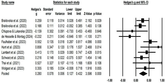 The sensitivity analysis using the one-study-removed method showed that removing any single study from the meta-analysis produced a weighted effect size between g = 0.24 and g = 0.32. These values fall within the 95% confidence interval of the total pooled weighted effect size [0.13, 0.43]. Therefore, no single study would be considered an outlier with significant influence on the results of the meta-analysis.
