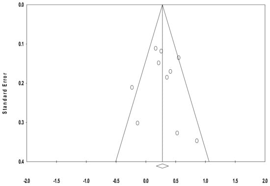 Figure 3 shows the funnel plot of effect sizes for the 10 included studies. Visual inspection of the funnel plot indicated symmetry, and Egger’s test for asymmetry of the funnel plot was non-significant (p = 0.85). Both results suggested the absence of publication bias.