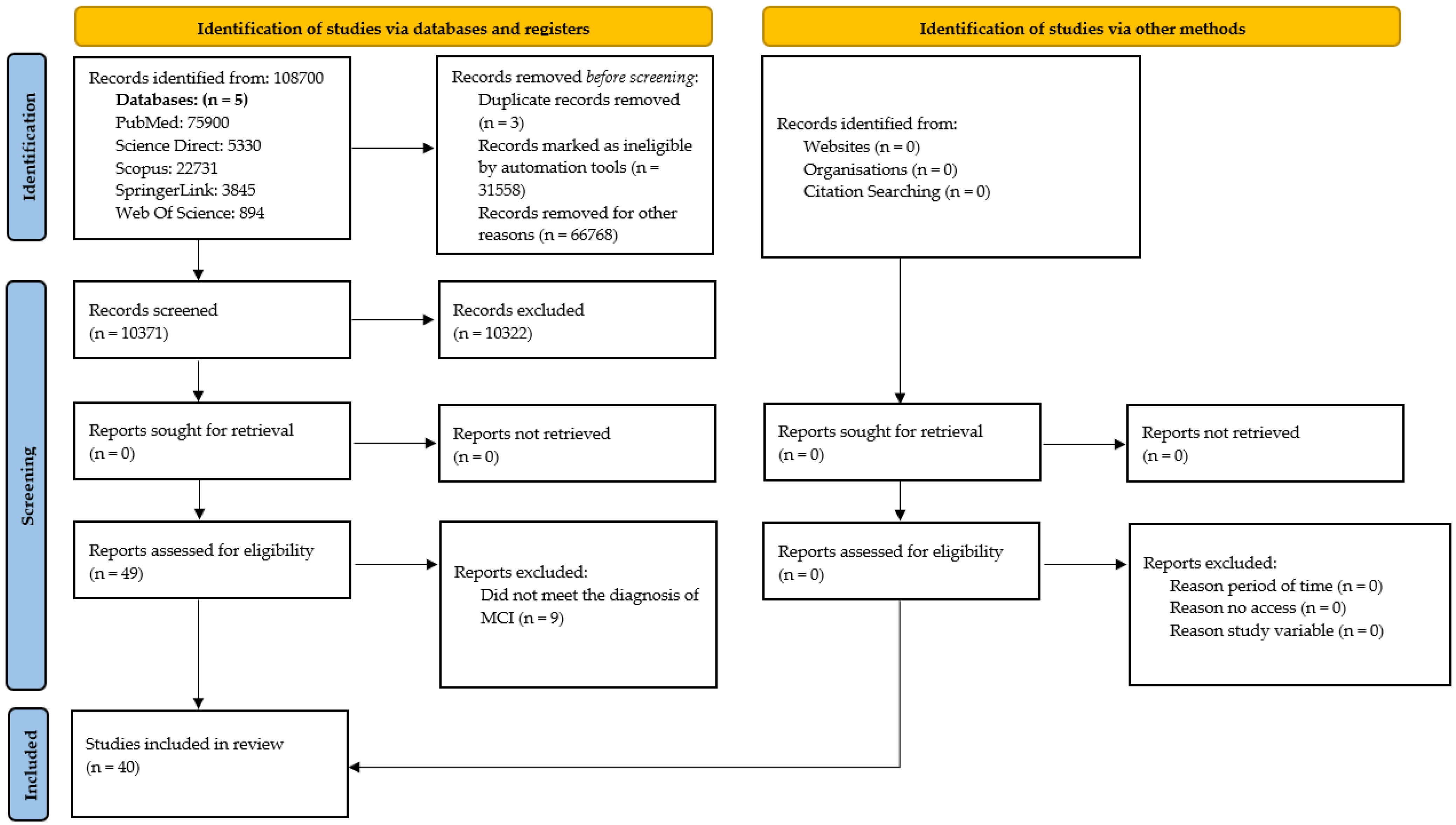 Studies that did not meet the aforementioned criteria were excluded from the review. In particular, research published prior to 2017 or involving participants under the age of 50 was not considered. Studies that did not focus primarily on MCI—such as those addressing subjective cognitive decline, dementia, or other neurocognitive disorders—were also excluded, as were publications in languages other than English. Similarly, studies employing descriptive designs, systematic reviews, or narrative reviews were excluded, as they do not allow for direct evaluation of intervention outcomes. Finally, any study that failed to clearly assess either pharmacological or non-pharmacological therapeutic approaches to MCI was excluded from the analysis.