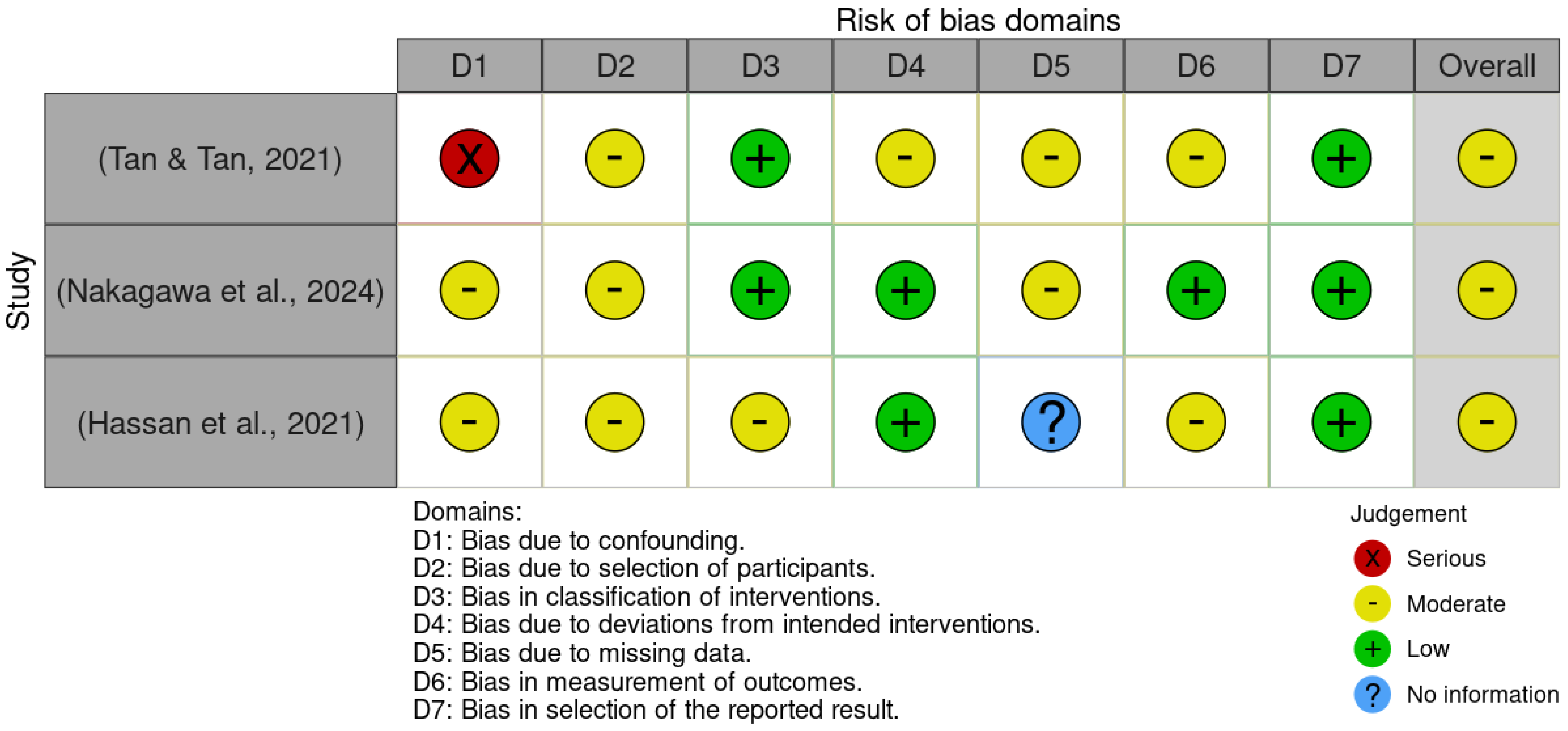 Nevertheless, the domain related to selective reporting (D7) showed no signs of bias in any of the three studies, suggesting that outcomes were reported completely and without manipulation. Additionally, the domains concerning intervention during the study (D3) and deviations from intended intervention (D4) did not reveal significant bias, indicating that the intervention was administered appropriately and without major deviations.