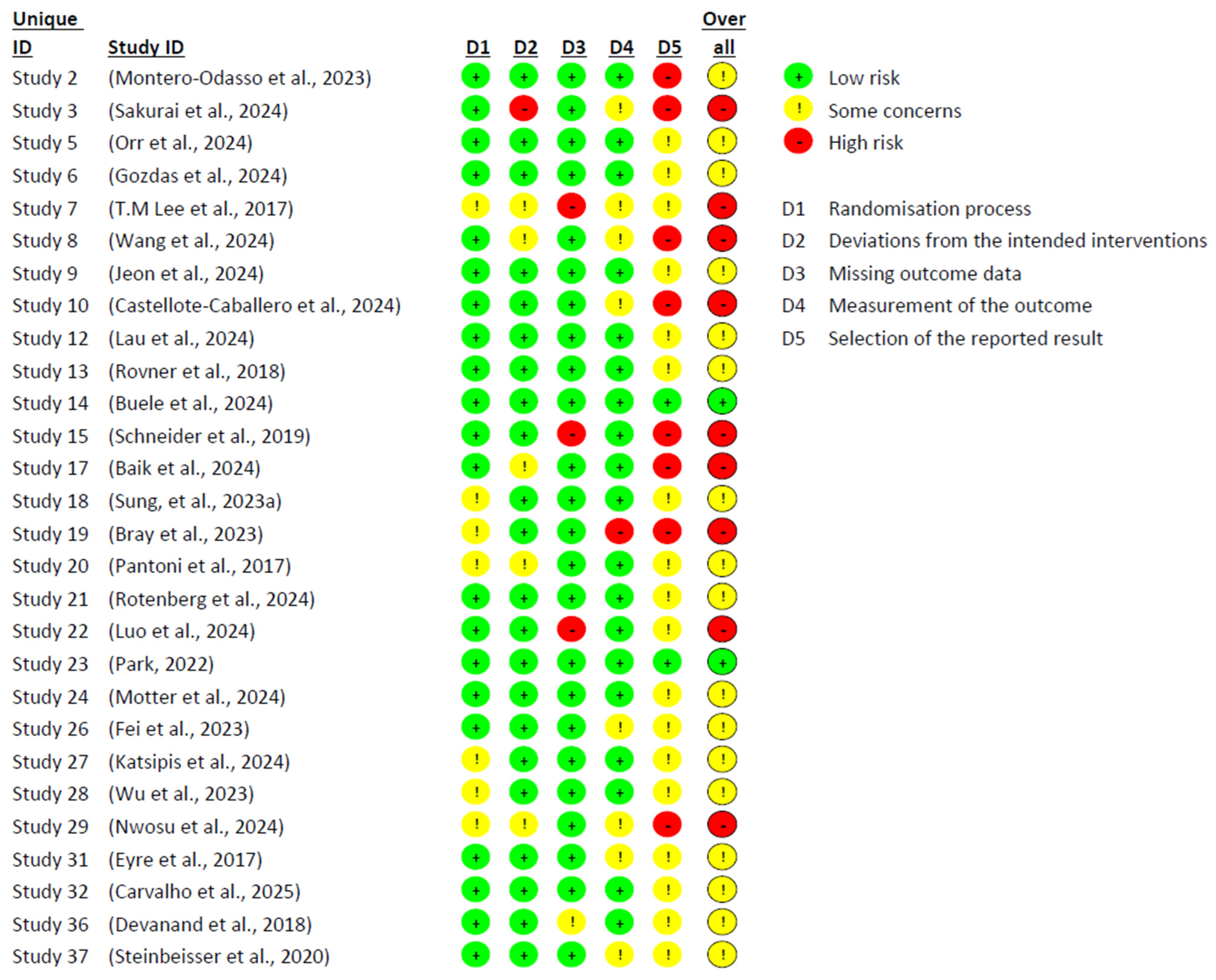 As expected, the three non-randomised studies displayed methodological limitations inherent to their design. The most affected domains were: confounding (D1), selection of participants (D2), and handling of missing data (D5). Issues identified included the lack of comparison groups, unclear participant selection procedures, and inadequate (or unreported) management of attrition and missing data.