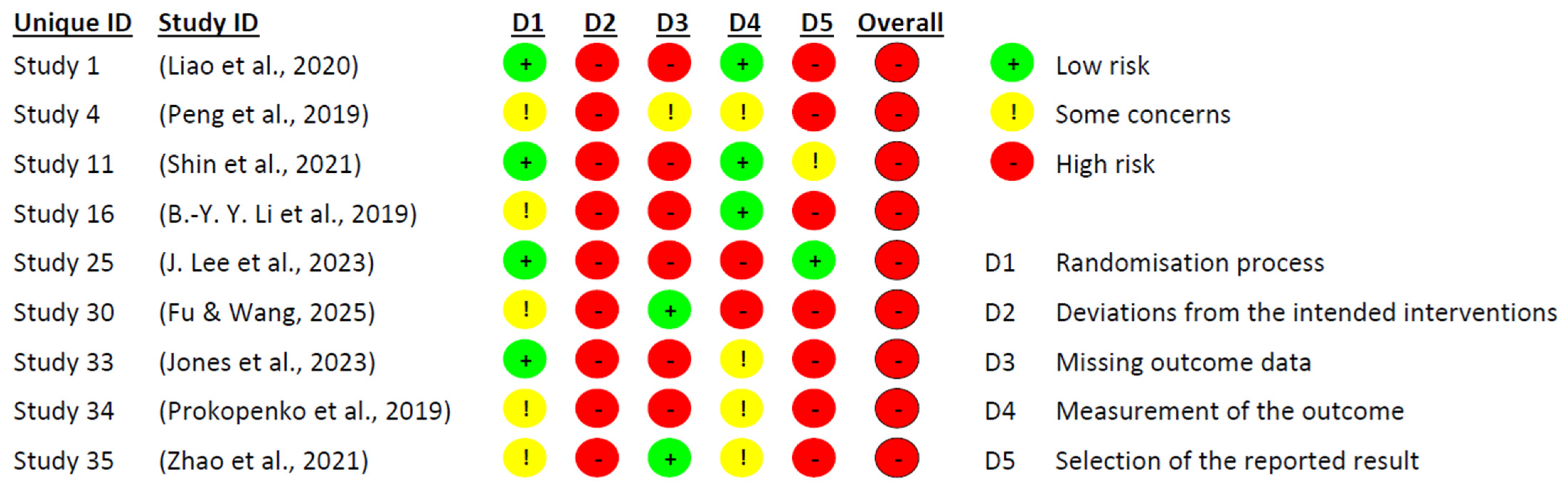 Domain 5—related to outcome reporting—was the most frequently compromised. In many studies, pre-specified protocols were either not declared or not accessible, making it difficult to compare planned and reported outcomes. Furthermore, signs of post hoc decisions and unreported exploratory analyses were identified, which may have artificially inflated the observed effects. In contrast, Domains 1 (random sequence generation), 2 (deviations from intended interventions), and 3 (missing outcome data) showed comparatively lower risk, though not without issues. Instances such as lack of allocation concealment, absence of blinding among intervention staff, participant attrition, and poor adherence to protocols were still observed. Many of these limitations appeared to be closely linked to the nature of non-pharmacological interventions—such as cognitive training, physical exercise, or psychosocial programmes—in which blinding is often unfeasible and adherence tends to fluctuate considerably.