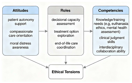 Figure 1 presents a conceptual framework illustrating the interrelationships between attitudes, roles, and competencies of clinical psychologists in the context of euthanasia for unbearable mental suffering (UMS). The model visualizes how supportive attitudes—such as endorsement of patient autonomy and underlying ethical beliefs—influence psychologists’ perceptions and enactment of their professional roles within multidisciplinary euthanasia care teams. Concurrently, knowledge, practical skills, and training constitute critical competencies that enhance role acceptance and effective participation in the euthanasia process. Ethical tensions, specifically the balance between respecting patient autonomy and protecting vulnerable individuals, mediate the dynamics between attitudes and role perceptions.