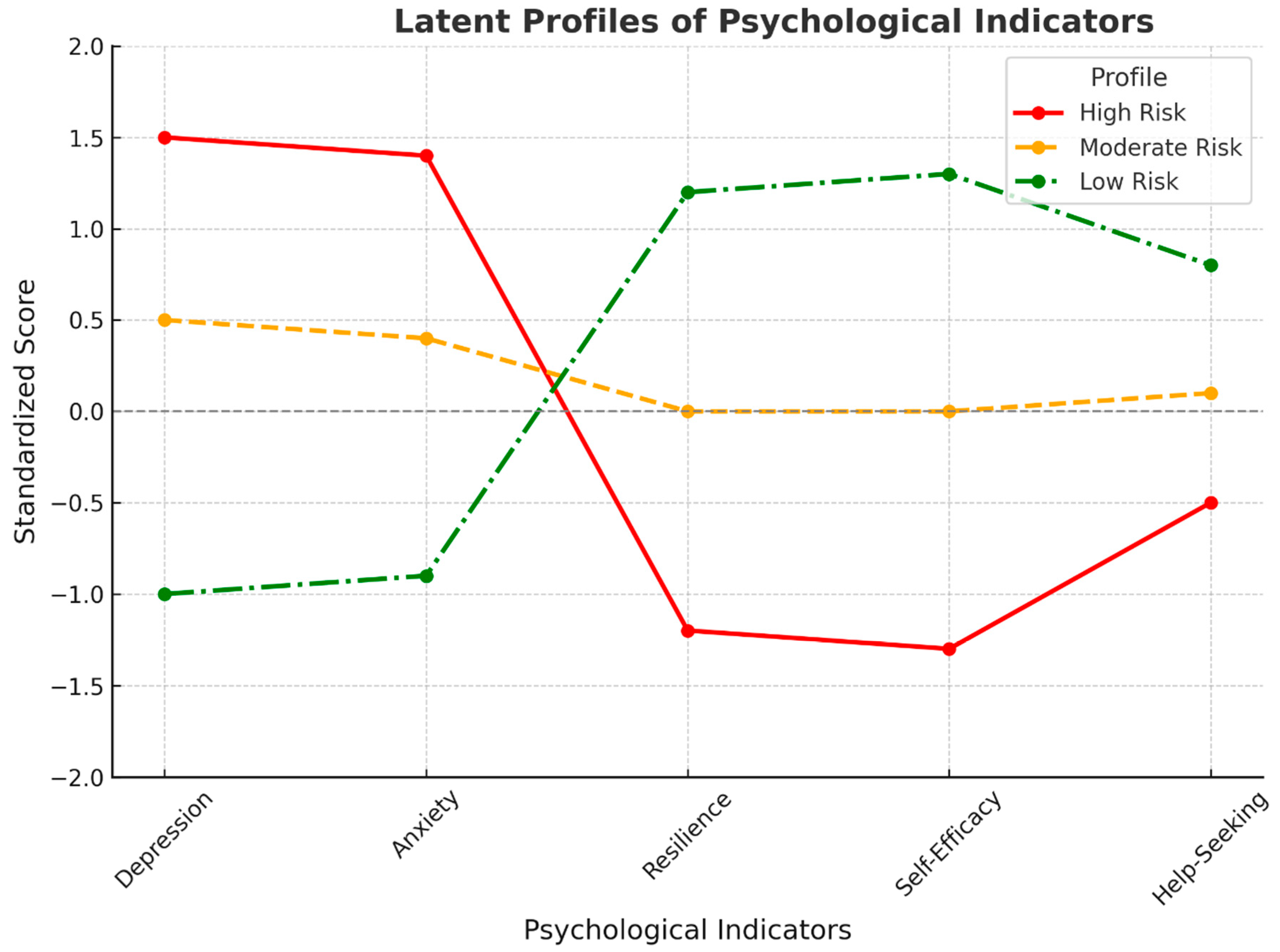 Latent profile analysis identified three psychological subgroups: low risk, moderate risk, and high risk. High-risk students, based on the severity of depression, anxiety, low self-efficacy, and resilience, were more likely to exhibit suicidal ideation. This person-oriented view brings out the heterogeneity of the student population and the need for personalized intervention strategies. Universal mental health care may not be adequate for the high-risk group unless it contains components that buffer hopelessness and facilitate cognitive self-regulation. Indeed, students with a high-risk profile were nearly six times more likely to report suicidal ideation than those with a low-risk profile, highlighting the need for tiered interventions that match students’ psychological needs to appropriate levels of care (