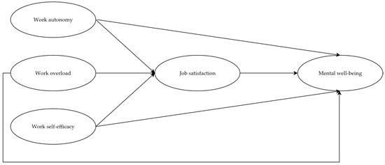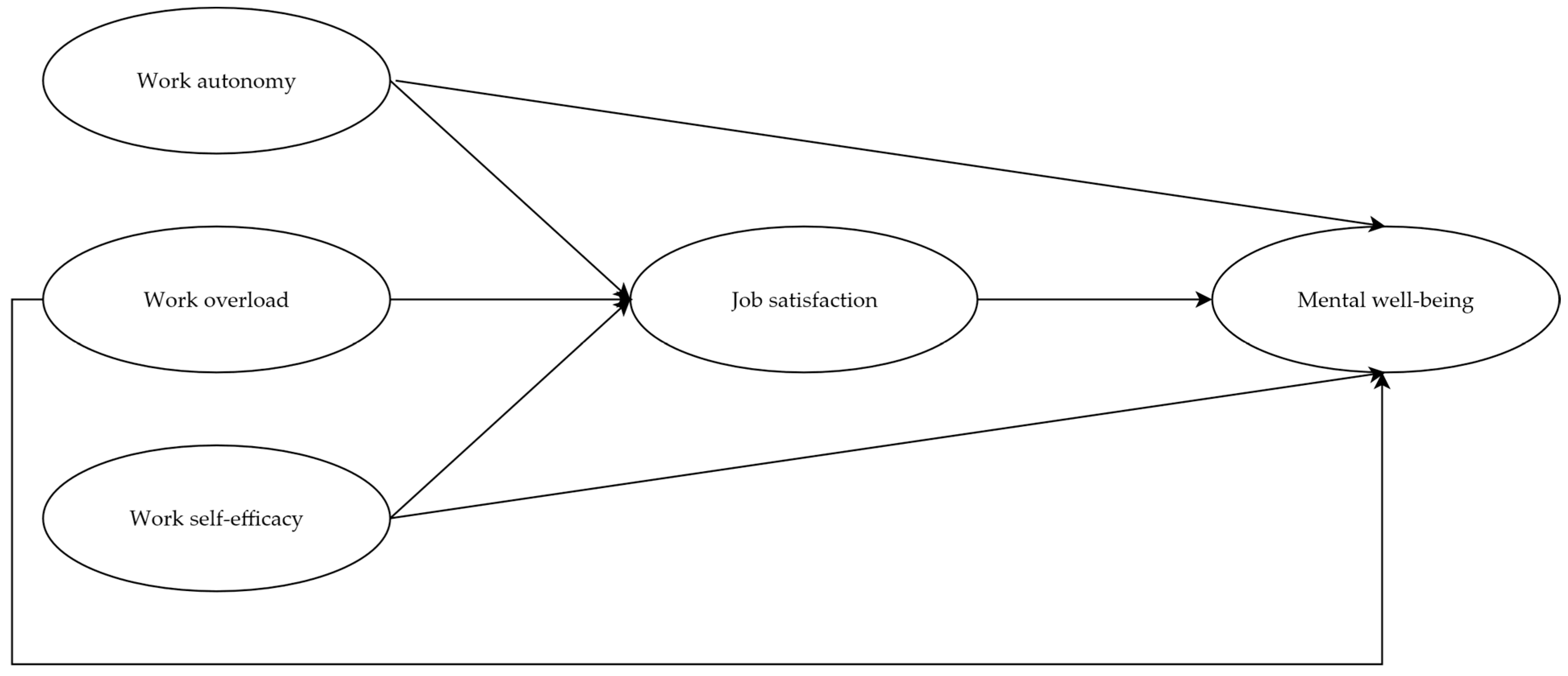 Job satisfaction mediates relationships between work autonomy (H4a), work overload (H4b), work self-efficacy (H4c), and mental well-being.