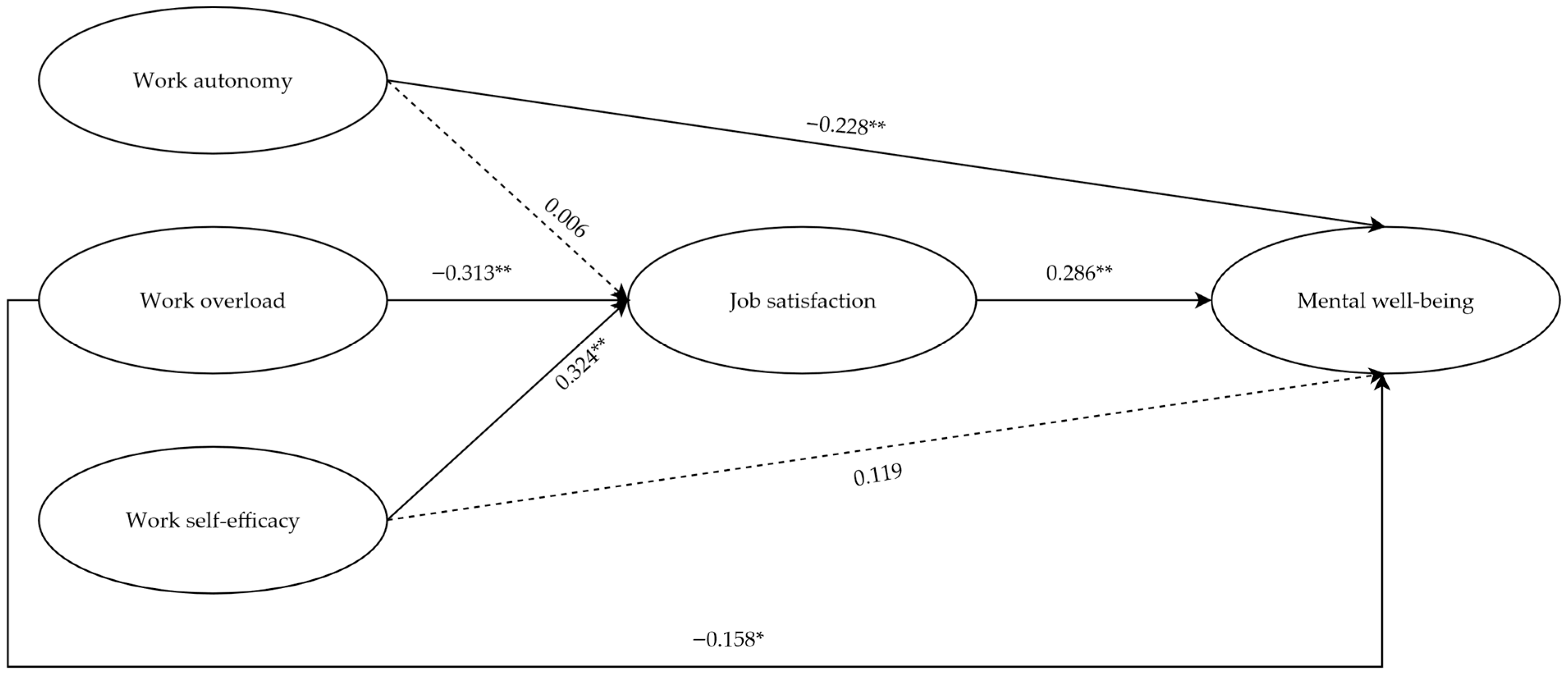 Mediation analyses were run to verify the hypothesized mediating effects of job satisfaction. Specifically, analyses revealed a full mediation of job satisfaction on the relationship between work self-efficacy and mental well-being and a partial mediating effect on the path between work overload and mental well-being. Conversely, job satisfaction did not mediate the path between work autonomy and mental well-being.