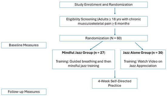 Study participants (n = 60) inclusion criteria were: self-reported 18 years of age or older, English-speaking American adults, living in the U.S., minimal exposure to jazz music, having a chronic musculoskeletal pain diagnosis with pain lasting at least 6 months and ≥4 on a 0 to 10 Numeric Rating Scale (NRS) during the week prior to study enrollment. Exclusion criteria included recent opioid use within the past 3 months; a current cancer diagnosis; significant neurological or psychiatric conditions, such as untreated post-traumatic stress disorder (PTSD) or bipolar disorder; engagement in other ongoing mindfulness or music-based interventions; or reported participation in clinical trials for chronic pain within the past year.