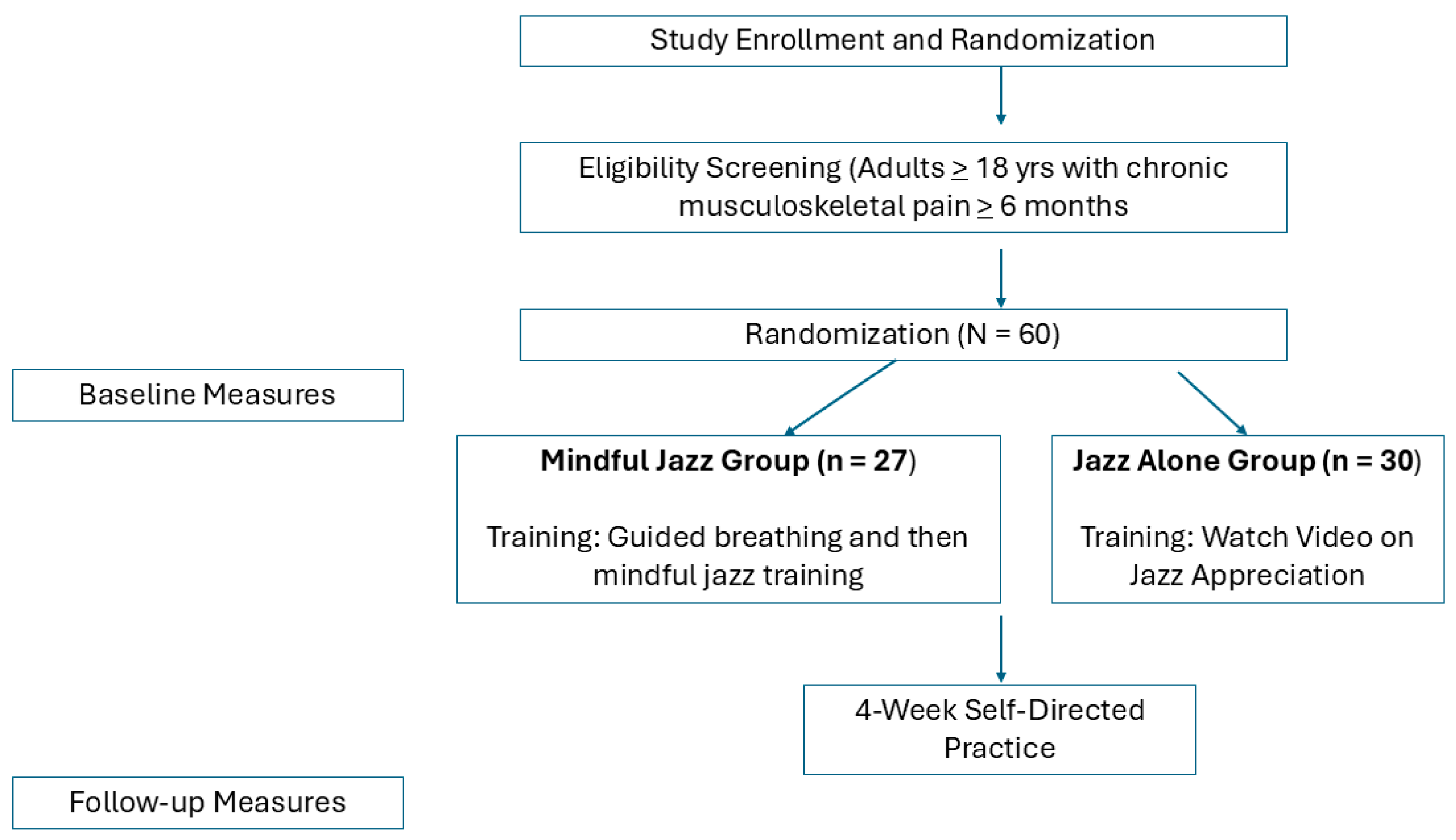 - Young, S. D., Kim, J., & Hanley, A. (2025). Mindful Jazz and preferred music interventions reduce pain among patients with chronic pain and anxiety: A pilot randomized controlled trial. Cureus, 17(3), e80485. [Google Scholar] [CrossRef]