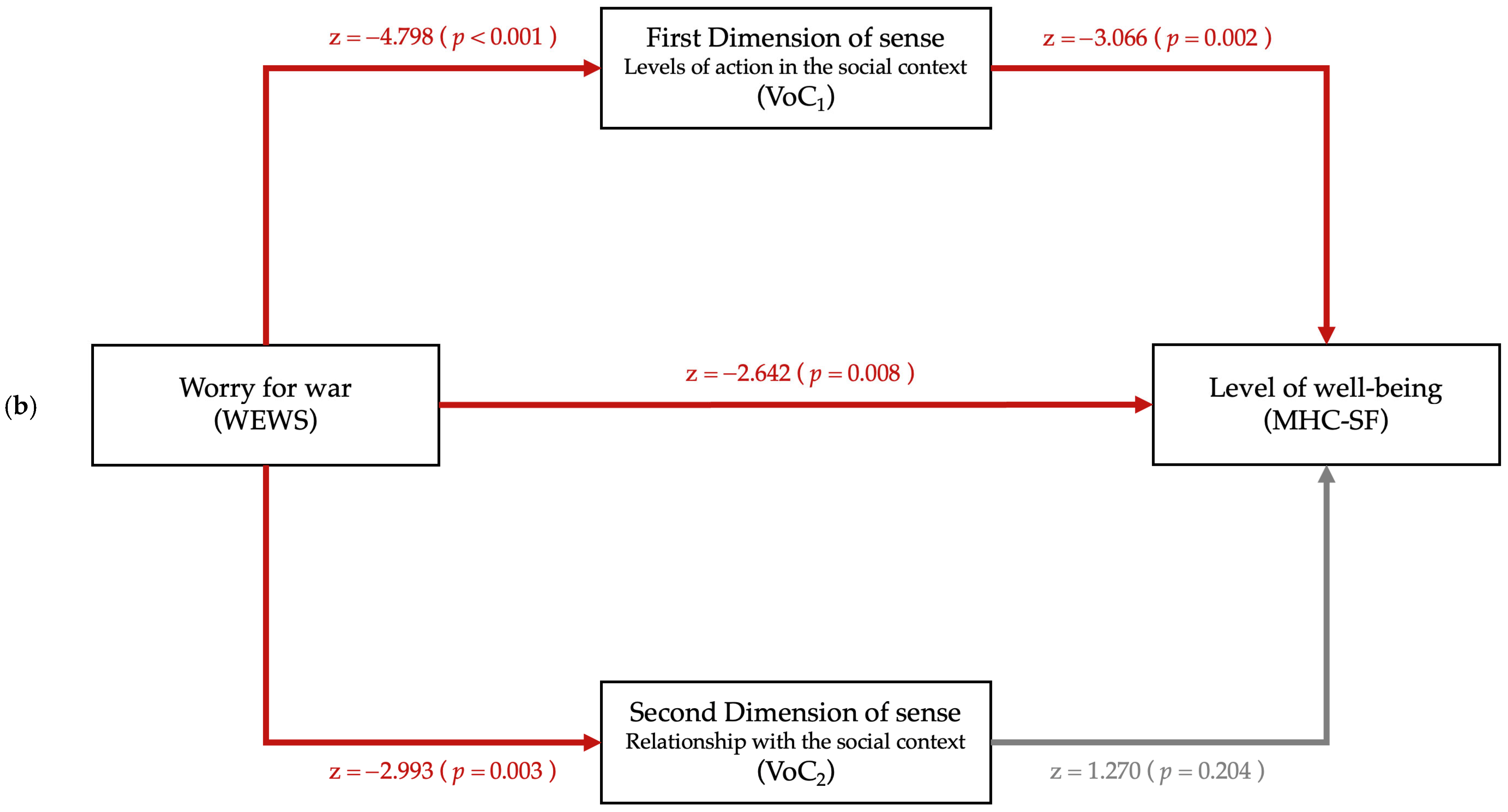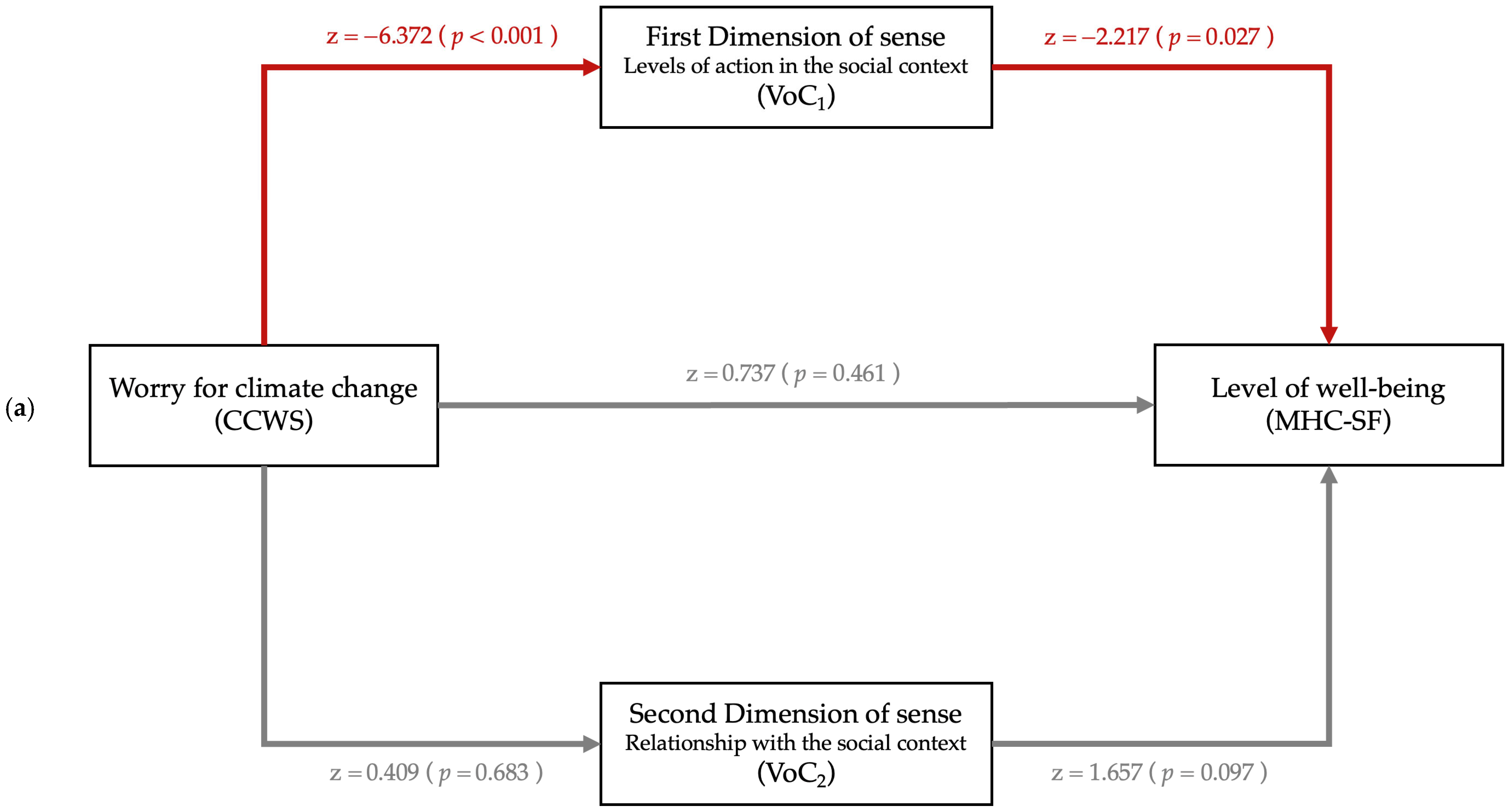 - Finally, mediation models were computed to assess (Q5) how meanings (i.e., Latent Dimensions of Meanings by Views of Context [VoC]) mediate the relations between worry about climate change and war, and levels of wellbeing and general distress.