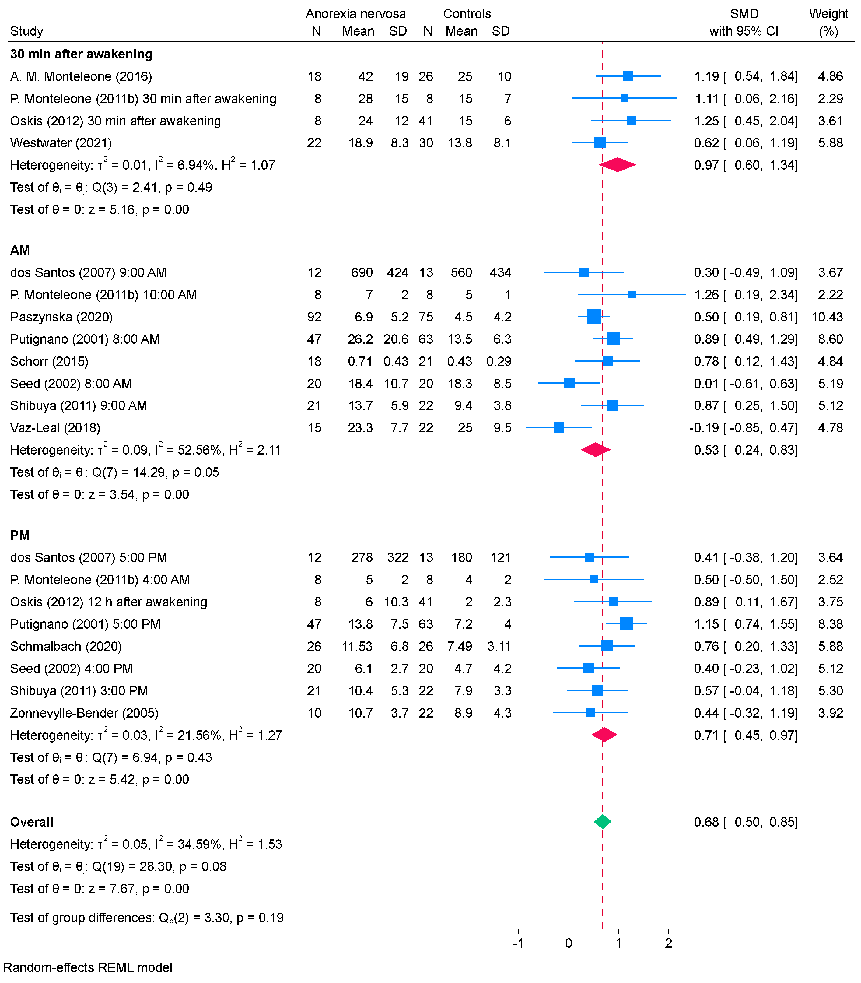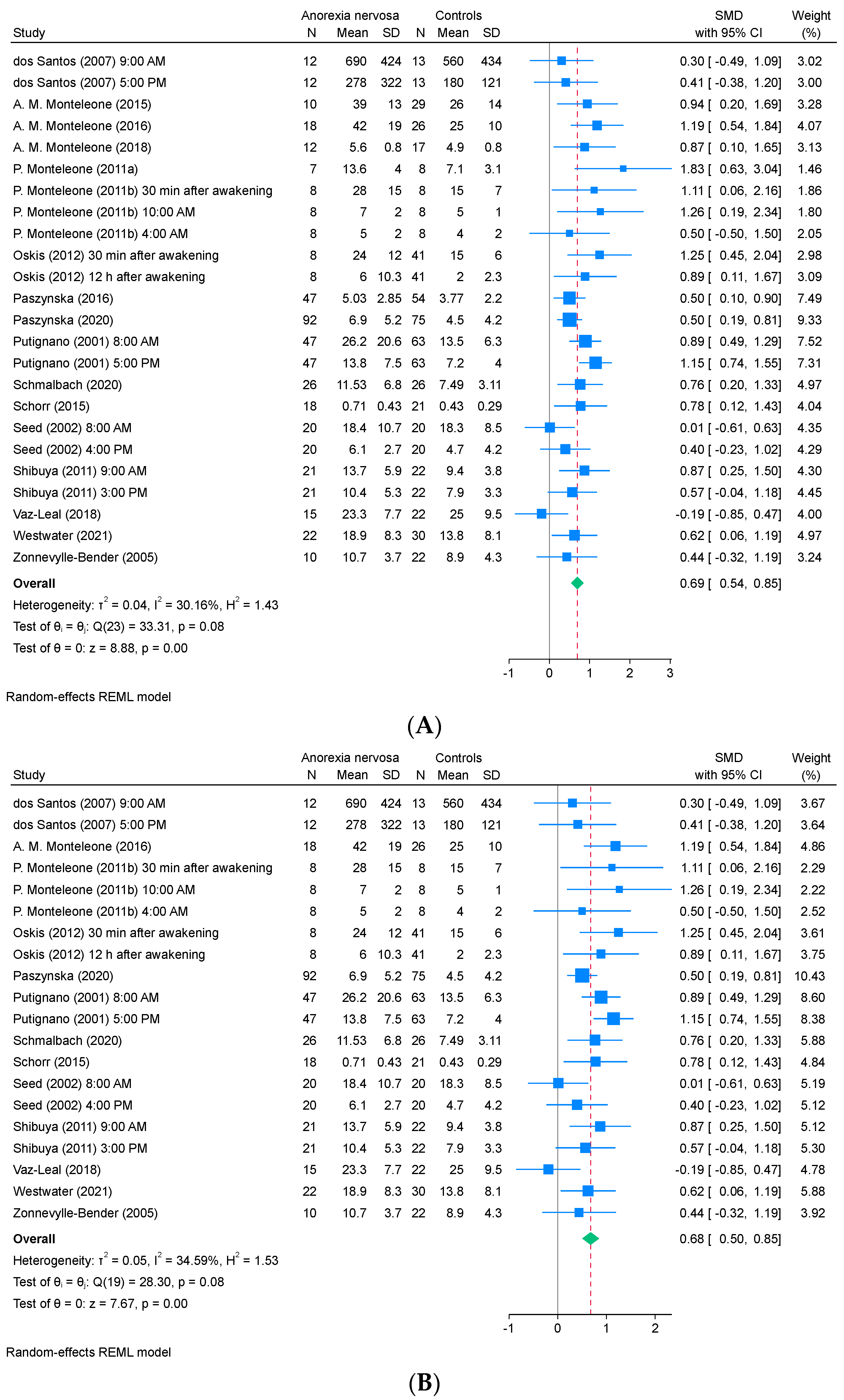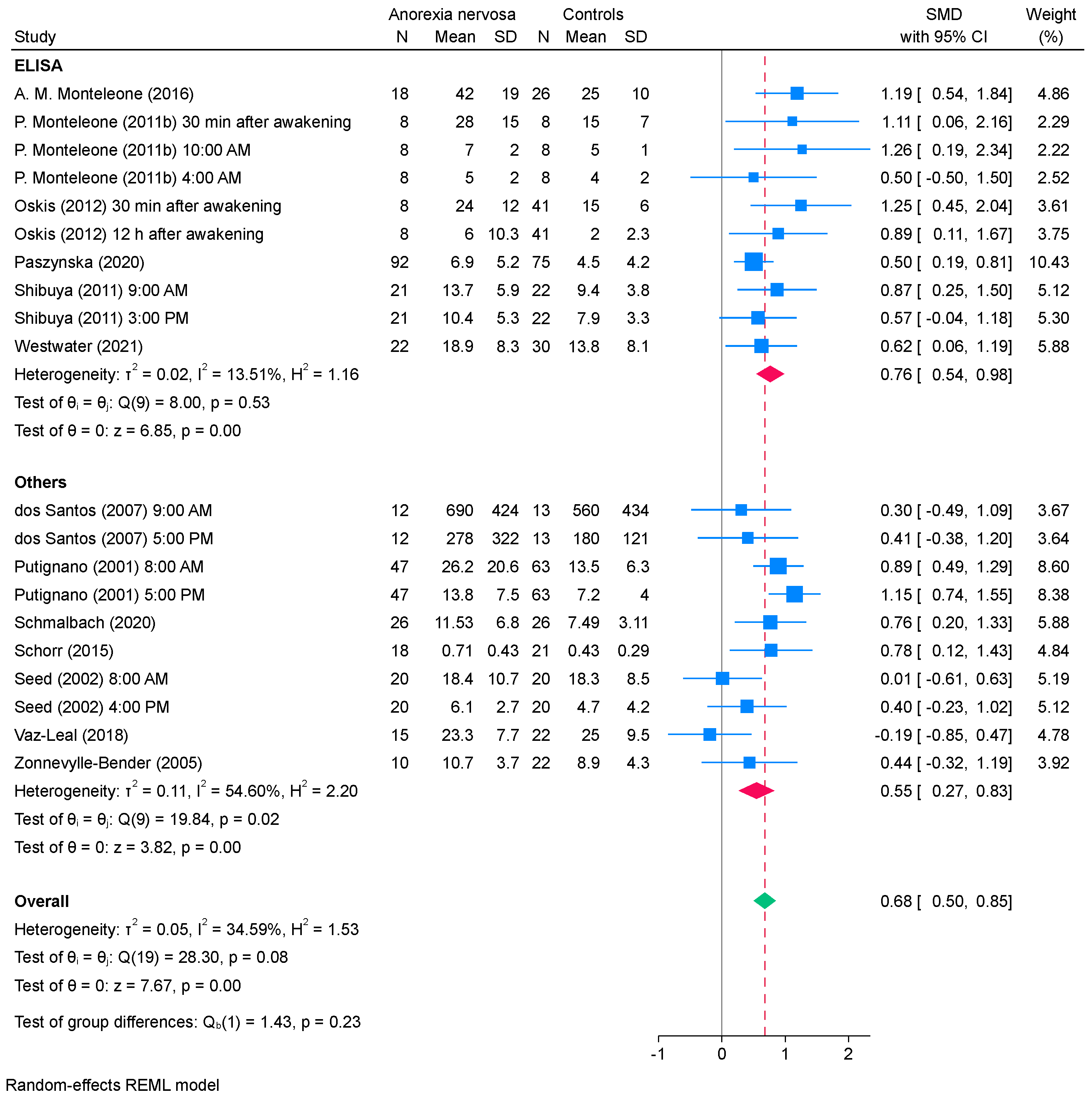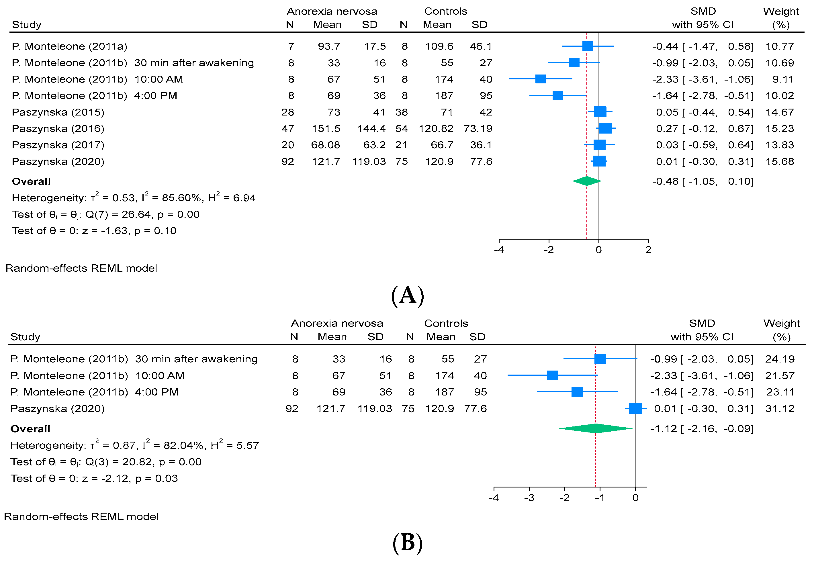 | 13 | Schmalbach et al. (2020) | Both | AN HC | 26 26 | 26.5 ± 6.1 25.0 ± 5.3 | 19.3 ± 3.4 23.08 ± 3.3 | NR | Cortisol | LIA | Between 2:00 PM and 4:00 PM | 10 |