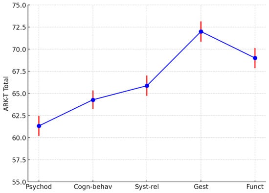 The ARK-T total score was higher for the Gestalt therapy and Functional therapy models compared with other therapeutic models, with intermediate scores for the systemic–relational model and the lowest scores for the psychoanalytic model (F = 13.3, df = 4, 153; p < 0.001).