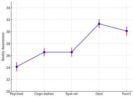 Body awareness least squares means by psychotherapy models. Psychod, psychoanalytic and psychodynamic therapists; Cogn-behav, cognitive, cognitive–behavioral, and cognitive–evolutionary approaches; Syst-Rel, systemic–relational therapists; Gest, Gestalt therapists; Func, functional therapists. The different colors are used to represent distinct elements of the data: blue represents the mean values of the ARK-T Total score for each category (Psychod, Cogn-behav, Syst-rel, Gest, Funct); red represents the error bars for the corresponding mean values. The combination of these colors helps visually distinguish the data points (blue) from the variability in the measurements (red).