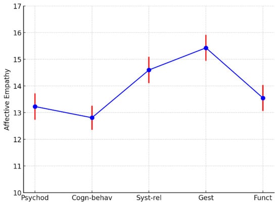 For the “affective empathy” factor, statistically significant differences were also observed (F = 5.0, df = 4, 153; p < 0.001), with higher scores for Gestalt and systemic–relational therapists, and the lowest scores for the cognitive–behavioral model (Figure 3).