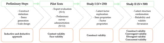 The first phase was devoted to the process of construct definition, item construction, and instrument design, followed by an evaluation of the relevance of the pool items by a panel of experts and a pilot test with a group of young adults to assess the clarity and comprehensibility of the generated items.