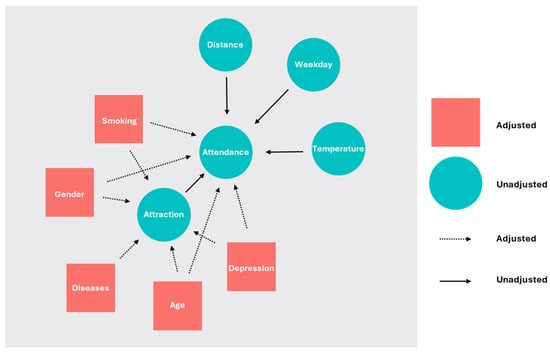 The following supporting information can be downloaded at https://www.mdpi.com/article/10.3390/ejihpe15030031/s1, Table S1. Causal model of AAS on adherence; Table S2. Predictive models of adherence; Table S3. Parameters of the model predicting adherence; Figure S1. Interaction between temperature and attraction; Figure S2. Calibration plot of the predictive model; Figure S3. ROC curve plot of the predictive model; Figure S4. Relation between attendance and pathologies; Figure S5. Relation between attendance and alcohol; Figure S6. Relation between attendance and distance from the exercise site; Figure S7. Relation between attendance and all the subscales of AFFEXX; Figure S8. Relationship between attendance, weekday and temperature; and Figure S9. Percentage of session attendance per weekday.