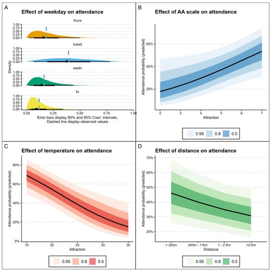 Marginal effect of AAS on probability of attending each session: (A) effect of weekday on attendance; (B) effect of AA scale on attendance; (C) effect of temperature on attendance; and (D) effect of distance on attendance.