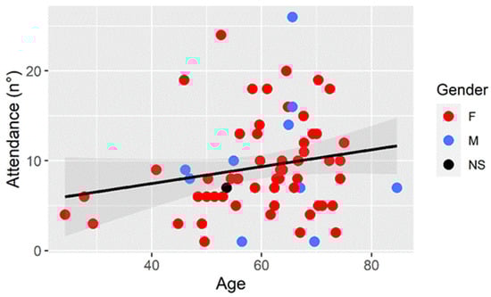 Participants attended exercise sessions on average 9.2 ± 5.5 times with no significant differences noted between males and females. While a weak positive correlation (r = 0.195) with participant age was observed, it did not reach statistical significance (p > 0.05) (Figure 3).