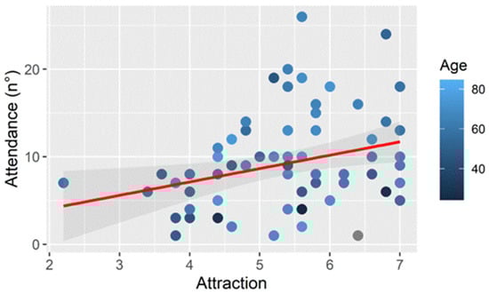 Examining the relationship between attendance and AFFEXX (Attendance–Attraction), it was found that participants with a higher Attraction sub-score attended more exercise sessions (r = 0.301, p < 0.05) (Figure 4).