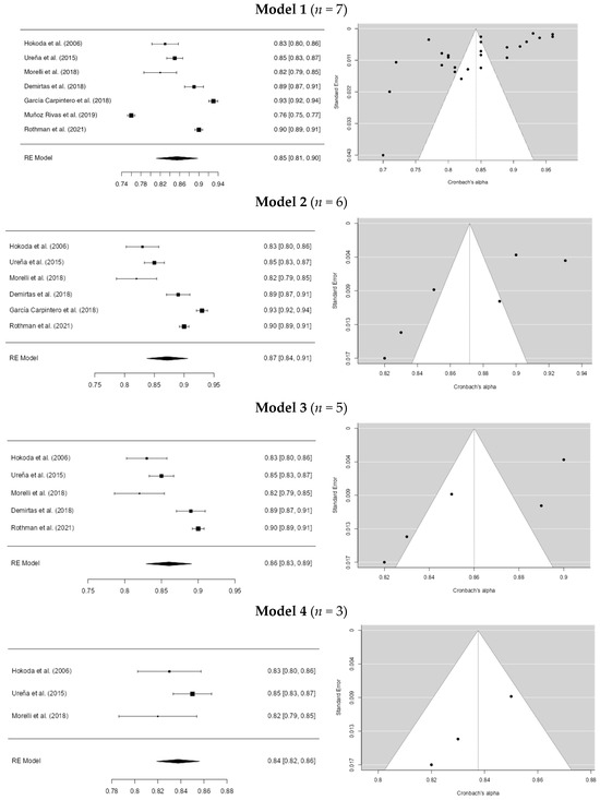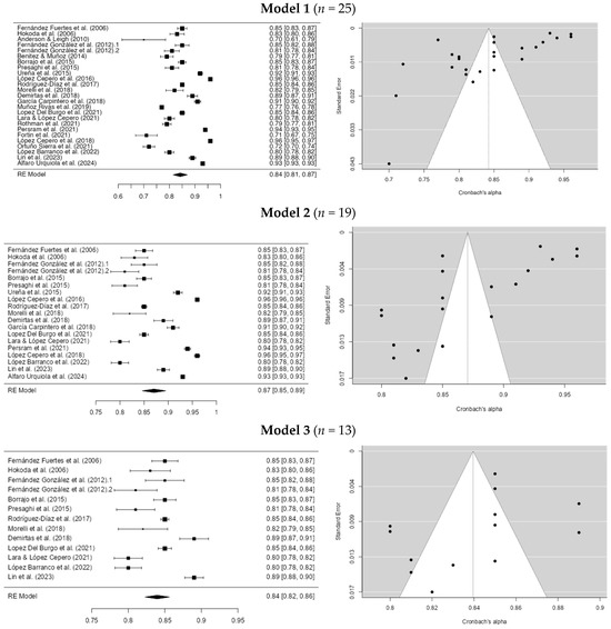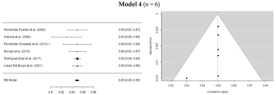 For the dating violence instruments in model 1, the Egger coefficient was −4.466 (p > 0.001) and the I2 was 99.57%. This is the initial model. In the second model, studies with an alpha below 0.80 were eliminated (Anderson & Leigh, 2010; Benítez & Muñoz, 2014; Muñoz-Rivas et al., 2019; Rothman et al., 2021; Ortuño-Sierra et al., 2023; Fortin et al., 2021). Minor differences in the coefficients were found, with Egger = −4.717 (p > 0.001) and I2 = 99.38%. In the third model, studies with an alpha greater than 0.90 were removed (Ureña et al., 2015; Persram et al., 2021; García-Carpintero et al., 2018; López-Cepero et al., 2016, 2018; Alfaro-Urquiola et al., 2024), resulting in coefficients of Egger = −1.607 (p = 0.108) and I2 = 93.68%. In model 4, studies with alpha values lower than 0.83 and higher than 0.85 were eliminated (Fernández-González et al., 2012; Presaghi et al., 2015; Morelli et al., 2018; Demirtas et al., 2018; Lara & López-Cepero, 2021; López-Barranco et al., 2022; C. Y. Lin et al., 2023). We obtained an Egger’s coefficient = −0.744 (p = 0.457) and an I2 coefficient = 0%. Thus, outliers seem to influence the initial model. However, these results should be interpreted with caution. For more information, see Figure 2.