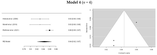 The second meta-analysis, which included four studies, synthesized the values of the Standardized Root Mean Square Residual (SRMR). The results showed a cumulative SRMR estimate of 0.0246 (SE = 0.0238) with a 95% CI ranging from −0.022 to 0.071, suggesting a moderately acceptable fit relative to the recommended cutoff point of 0.08. The statistics I2 = 0% and Q = 0.736 (p < 0.001) also indicated moderate heterogeneity. Similar to the first meta-analysis, Egger’s funnel plot did not reveal publication bias (Figure S8).