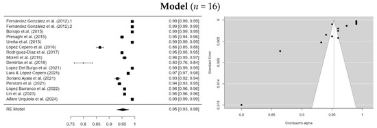 A total of three eligible studies reported McDonald’s omega (ω), but three measures met the criteria of omega > 0.80 or a sample size with a 10:1 ratio of cases per item (Table 1 and Figure S1). Egger’s regression test indicated significant asymmetry, consistent with potential publication bias (intercept = −2.878, p = 0.004). The highest internal reliability estimate was reported by López-Cepero et al. (2018), with an omega of 0.96 (DVQ, 42 items; n = 859). However, two other measures yielded acceptable omegas of 0.93 (Alfaro-Urquiola et al., 2024, DVQ-VP, 20 items; n = 3776) and 0.81 (Lara & López-Cepero, 2021, DVQ, 42 items; n = 846). Additionally, the most commonly used instruments were the Dating Violence Questionnaire (DVQ, López-Cepero et al., 2018; Lara & López-Cepero, 2021) and the Dating Violence Questionnaire for Victimization and Perpetration (DVQ-VP, Alfaro-Urquiola et al., 2024).