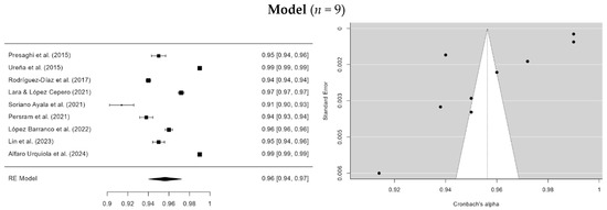 A random-effects meta-analysis was conducted to synthesize values from 9 studies that reported the Tucker–Lewis Index (TLI). The results show a cumulative TLI estimate of 0.956 (SE = 0.0826) with a confidence interval (95% CI = 0.940–0.973), indicating a good model fit for the meta-analysis (Figure 6). However, the statistics (I2 = 99.85%, Egger = −4.195, p < 0.001) and (Q = 2948.892, p < 0.001) indicated high heterogeneity among the studies, attributable to real differences rather than chance.